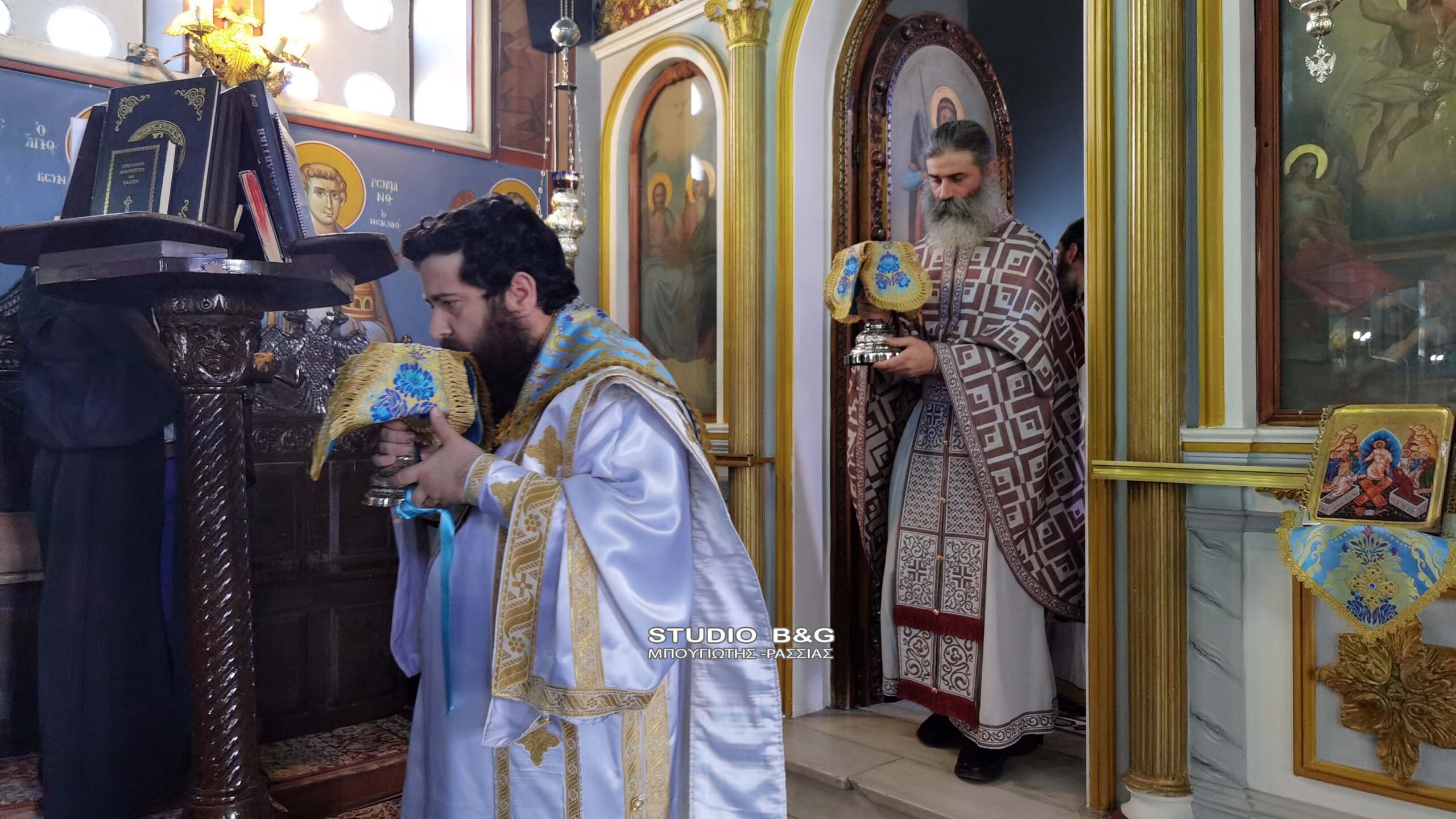 Η θεία λειτουργία πραγματοποιήθηκε επί της φιλοξενίας στον Ιερό ναό της Τιμίας Κάρας του Αγίου Μεγαλομάρτυρος Γεωργίου του Τροπαιοφόρου εκ της Ιεράς Μονής Ξενοφώντος του Αγίου Όρους.