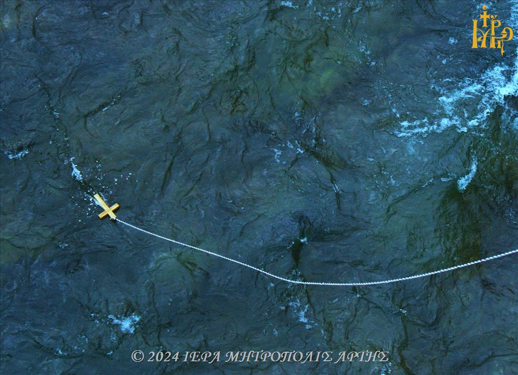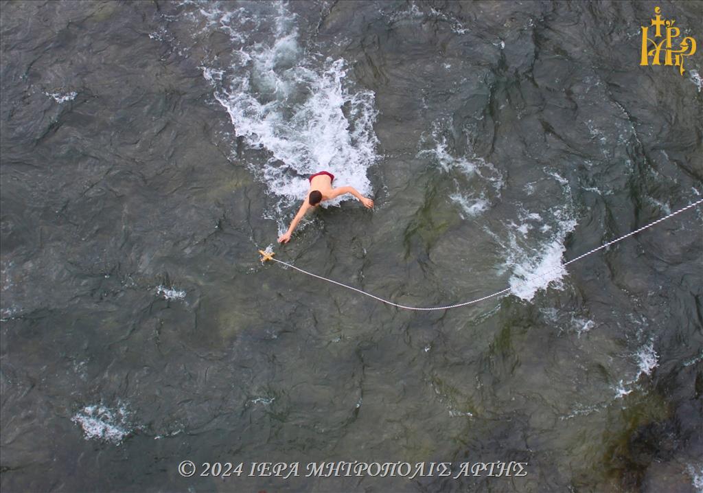 Στην συνέχεια, από το θρυλικό Γεφύρι της Άρτας, ο Σεπτός Ποιμενάρχης μας, ετέλεσε την καθιερωμένη κατάδυση του Τιμίου Σταυρού, στον Άραχθο ποταμό. Στο μήνυμά του, ο Σεβασμιώτατος ετόνισε, πως “Θεοφάνεια βιώνουν οι ψυχές, που μετανοώντας φωτίζονται”.