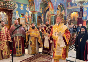 Η θεία Λειτουργία τελέσθηκε σε διαμορφωμένο χώρο στο Σολέα του Ιερού Ναού, τον οποίον επιμελήθηκε με ιδιαίτερη φροντίδα ο Εφημέριος του Ιερού Ναού Αιδεσιμολ. π. Χρήστος Τσάκαλος, ο οποίος και με εμπνευσμένη ομιλία του με ιδιαίτερο σεβασμό αναφέρθηκε στο πολύκαρπο και πολύπλευρο έργο του Μακαριστού Ιεράρχου.