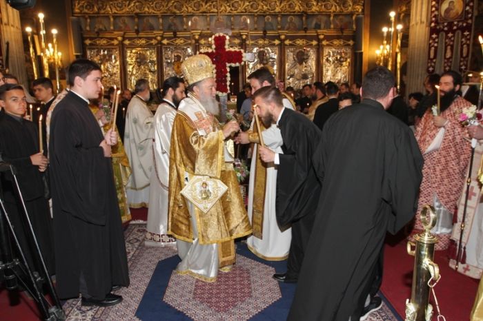 Το πρώτο και κύριο μέρος της Συνάξεως ήταν η αρχιερατική θεία λειτουργία στον Ιερό Ναό Αγίου Νικολάου Χαλκίδος. Προ της ενάρξεώς της, στο τέλος του Όρθρου, σύμφωνα με την τάξη της Εκκλησίας, έγινε και η τελετή της Λιτάνευσης και Προσκύνησης του Τιμίου Σταυρού, υπό του Σεβασμιωτάτου Μητροπολίτου Χαλκίδος κ. Χρυσοστόμου, με τη συμμετοχή Κληρικών της Ιεράς μας Μητροπόλεως, όπως και πυκνού εκκλησιάσματος.