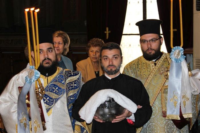 Κατά τη διάρκεια της ακολουθίας του Όρθρου και της Θεία Λειτουργίας έψαλλε ο χορός της Σχολής Βυζαντινής Μουσικής ”Άγιος Ιωάννης ο Δαμασκηνός” της Ιεράς μας Μητροπόλεως, υπό τη χοραρχία του κ. Ιωάννη Παπαχρόνη, Διευθυντή της Σχολής”.