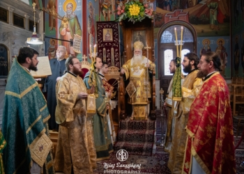 Στον Ιερό Ναό Κοιμήσεως της Θεοτόκου χοροστάτησε στην Ακολουθία του Όρθρου και προεξήρχε στην Θεία Λειτουργία, κατά την διάρκεια της οποίας χειροτόνησε στον βαθμό του Πρεσβυτέρου τον Διάκονο Δημήτριο Μουτσώκο.