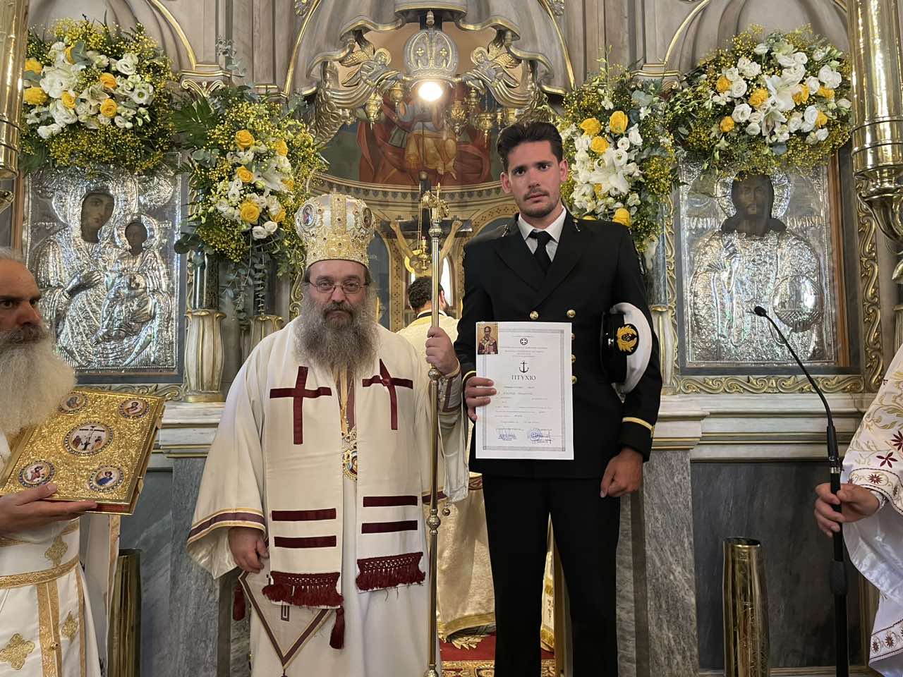 Στο πέρας της Θ. Λειτουργίας, κατόπιν αδείας και του Διοικητού της ΑΕΝ Πλοιάρχων Οινουσσών κ. Δημ. Κλουμάση, ο Σεβασμιώτατος επέδωσε το Πτυχίο στον πρώτο αριστούχο απόφοιτο της ΑΕΝ κ. Θεόδωρο Στείρο του Σταύρου, εκ των στελεχών της Κατασκηνώσεως της Ι. Μητροπόλεως Χίου ΤΟ ΚΑΡΑΒΙ ΤΟΥ ΧΡΙΣΤΟΥ και παιδί πολύτεκνης οικογένειας, με την ευχή η Αγ. Μαρκέλλα να τον προστατεύει στα ναυτικά ταξίδια του και να τον οδηγεί στο ταξίδι της ζωής μέχρι το λιμάνι της Βασιλείας του Θεού.