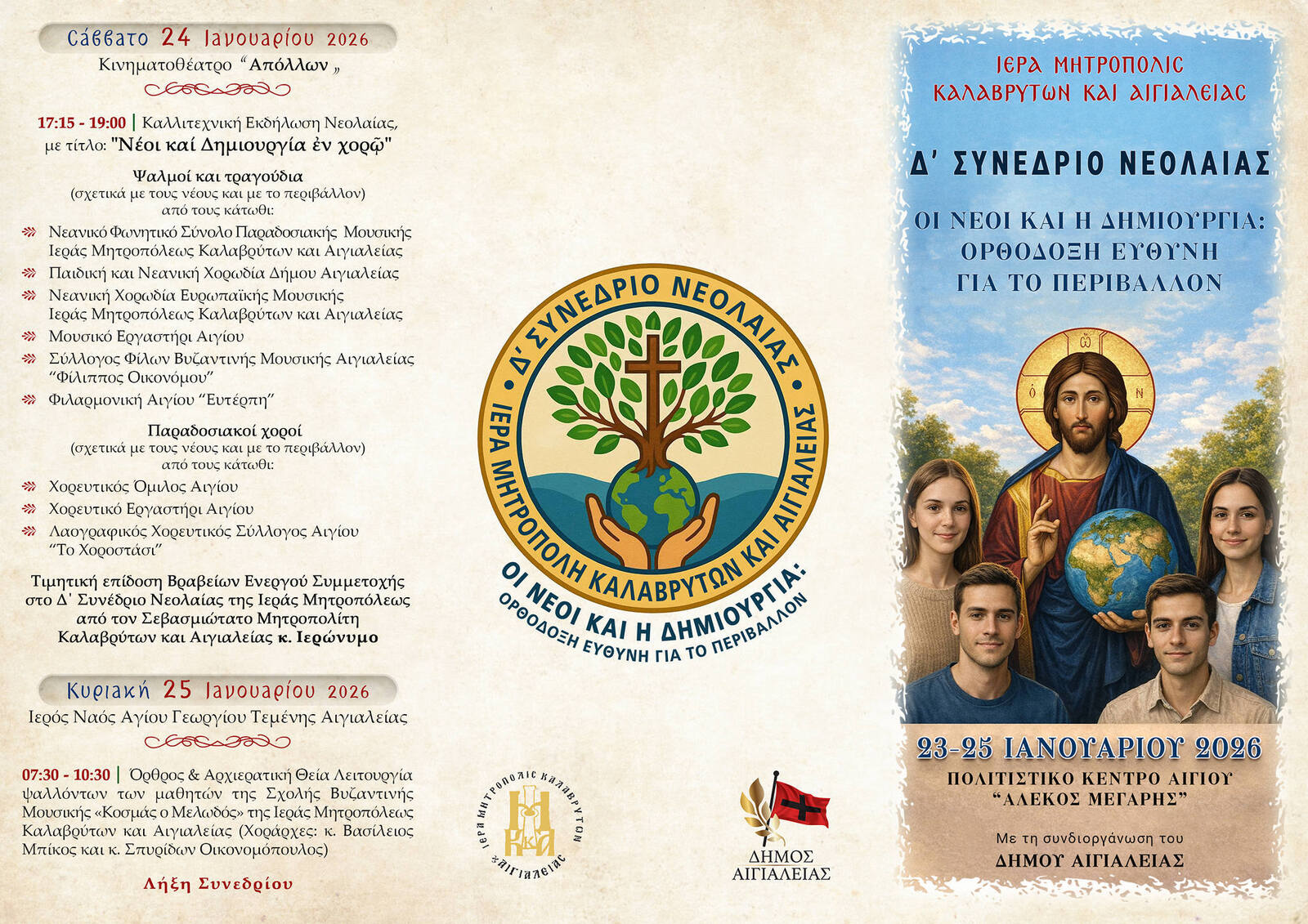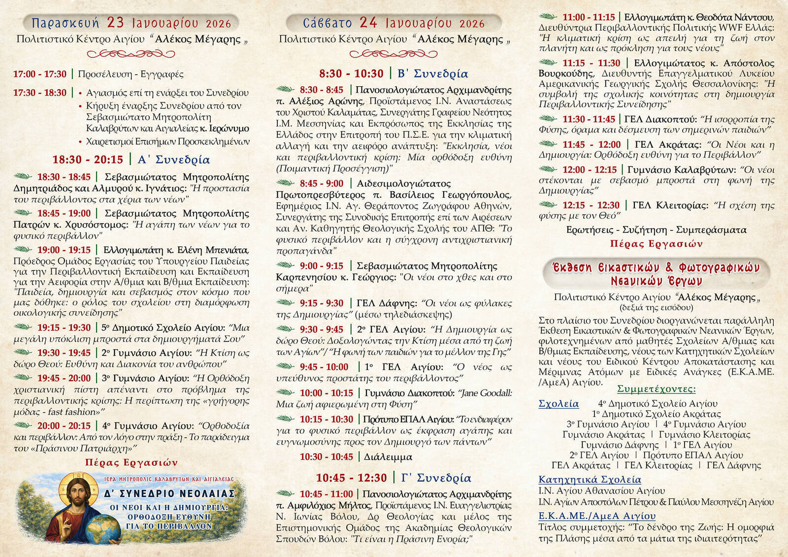 «Οι Νέοι και η Δημιουργία: Ορθόδοξη Ευθύνη για το Περιβάλλον», το οποίο τελεί υπό την αιγίδα του Μητροπολίτη Καλαβρύτων και Αιγιαλείας κ. Ιερωνύμου και συνδιοργανώνεται με τον Δήμο Αιγιαλείας, με τη συνδρομή της Περιφέρειας Δυτικής Ελλάδος.