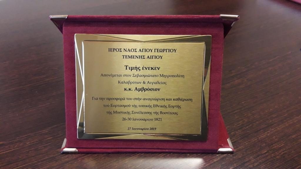 Ι. Μ. Καλαβρύτων: Είναι γνωστό πως η αξία τού ποιμαντικού έργου τού Σεβασμιωτάτου Μητροπολίτου Καλαβρύτων και Αιγιαλείας κ. Αμβροσίου τυγχάνει ευρείας αναγνώρισης από την τοπική κοινωνία, με συνέπεια πολλοί να είναι οι σύλλογοι και οι φορείς που είτε τον έχουν ήδη τιμήσει είτε έχουν εκφράσει την επιθυμία να προβούν στο μέλλον σε μία αντίστοιχη ενέργεια.