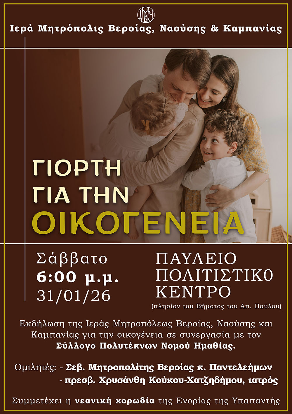 Ι.Μ.Βεροίας: Το Σάββατο 31 Ιανουαρίου στις 6.00 το απόγευμα στο Παύλειο Πολιτιστικό Κέντρο θα πραγματοποιηθεί εκδήλωση – γιορτή της οικογένειας που διοργανώνει η Ιερά Μητρόπολη Βεροίας, Ναούσης και Καμπανίας σε συνεργασία με τον Σύλλογο Πολυτέκνων Ν. Ημαθίας.