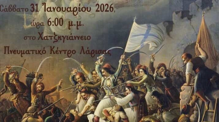Λάρισα: Το Σωματείο «Ενωμένη Ρωμηοσύνη», με την ευλογία της Ιεράς Μητροπόλεως Λαρίσης και Τυρνάβου, διοργανώνει το Σάββατο 31 Ιανουαρίου 2026 και ώρα 6:00 μ.μ. εκδήλωση στην αίθουσα του Χατζηγιάννειου Πνευματικού Κέντρου Λάρισας, με θέμα: «Η Έξοδος του Μεσολογγίου και ο επίσκοπος Ρωγών Ιωσήφ».