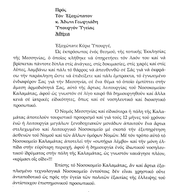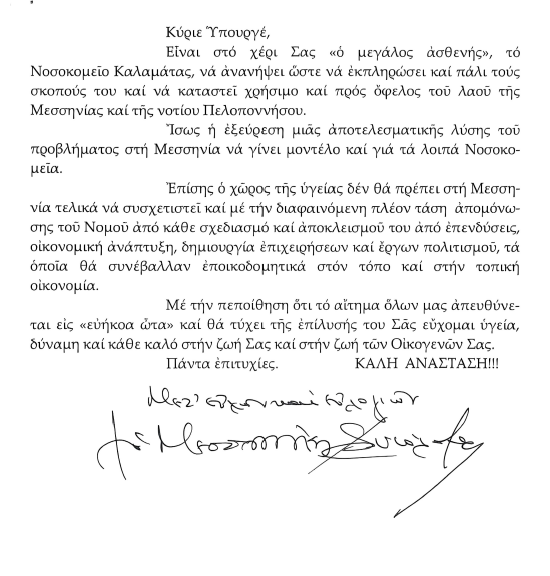 Όπως αναφέρει χαρακτηριστικά, «λαμβάνω και πάλι το θάρρος να απευθυνθώ σε Σας, για να εκφράσω την παράκληση ώστε να επιδείξετε έμπρακτα το ενδιαφέρον Σας για τη Μεσσηνία», επισημαίνοντας ότι το Νοσοκομείο Καλαμάτας αντιμετωπίζει σοβαρά προβλήματα υποστελέχωσης.