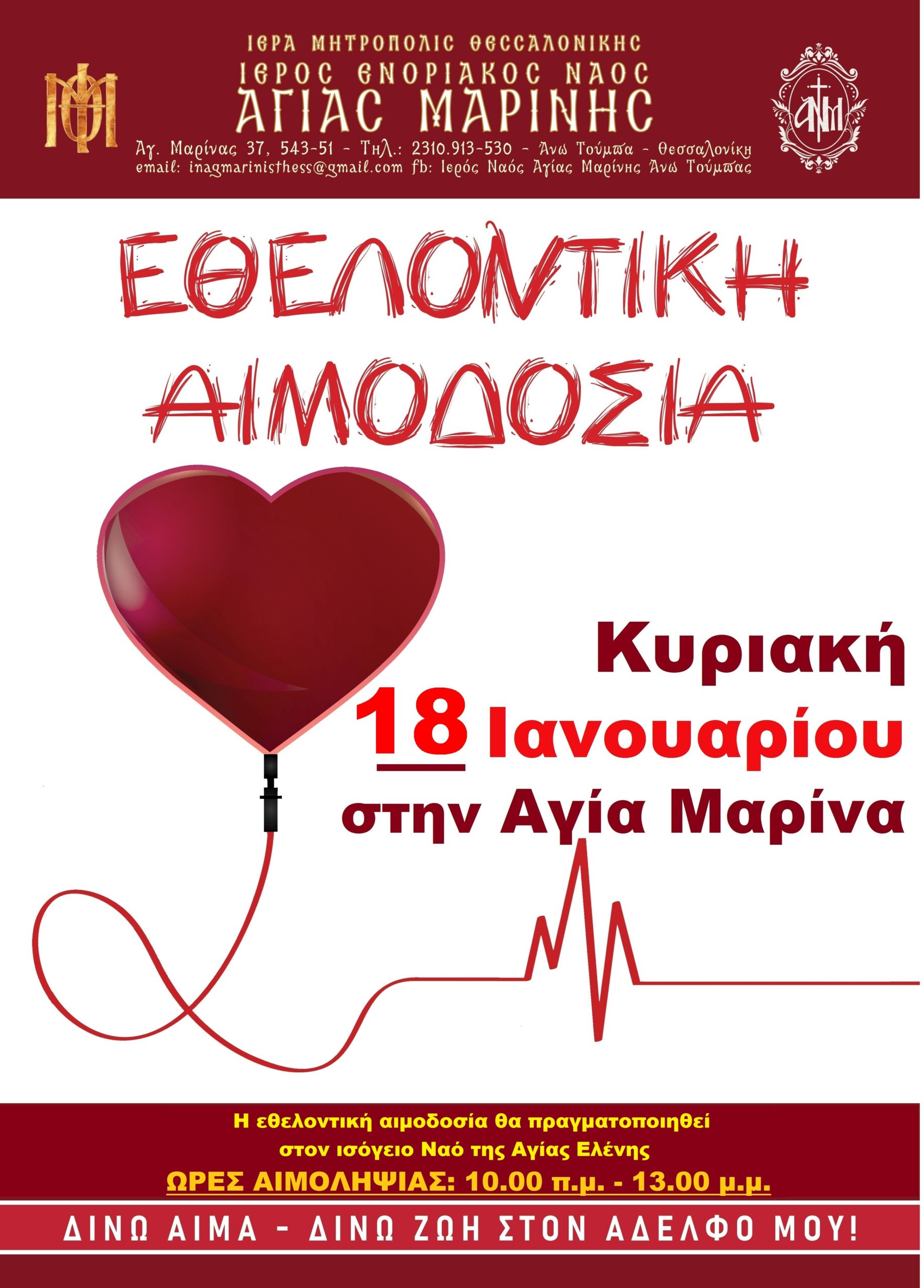 Τέλος, θα πραγματοποιηθεί εθελοντική αιμοδοσία στο Ναό της ενορίας την Κυριακή 18 Ιανουαρίου, 10.00 π.μ. – 1.00 μ.μ.