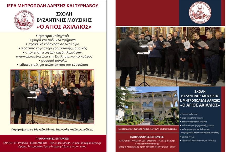 Ι.Μ. ΛΑΡΙΣΗΣ: Με την Χάρη και το άπειρο Έλεος του Παναγάθου Θεού και τις Ευλογίες του Σεβασμιωτάτου Μητροπολίτου μας Λαρίσης και Τυρνάβου κ. Ιερωνύμου, Προέδρου της Σχολής, η Σχολή Βυζαντινής Μουσικής «Ο Άγιος Αχίλλιος» ξεκινά για άλλη μια χρόνια τη λειτουργία της.