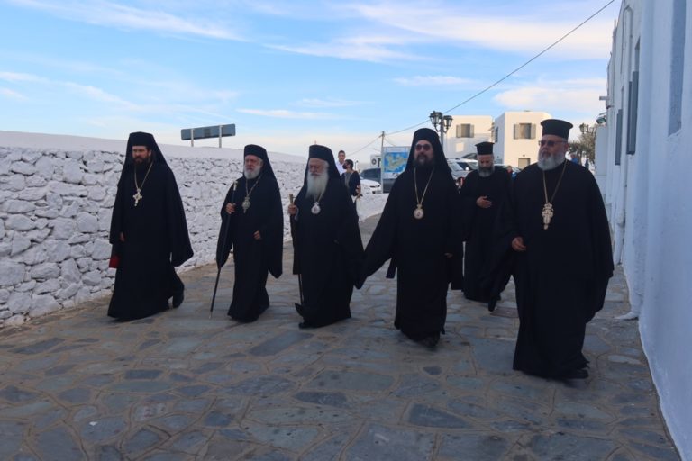 Τζαγκαρόλων Χανίων Κρήτης και Βοηθού του Οικουμενικού Πατριάρχου Επισκόπου Δορυλαίου κ. Δαμασκηνού, των Ηγουμένων των Ιερών Μονών Παναχράντου Άνδρου, Βρύσεως Σίφνου, Εσφιγμένου του Αγίου Όρους και της Ηγουμενευούσης της Ιεράς Μονής Ζωοδόχου Πηγής Άνδρου, των Εφημερίων της Μυκόνου, Κληρικών από τη Σύρο, την Τήνο, την Άνδρο, Μήλο. την Πάρο, τη Νάξο, την Αθήνα, τη Θεσσαλονίκη και την Αλεξανδρούπολη τελέσθηκε χθες βράδυ στο Καθολικό της εν Άνω Μερά Μυκόνου Ιεράς Μονής Παναγίας Τουρλιανής ο Πολυαρχιερατικός Εσπερινός των Εγκαινίων του εντός του συγκροτήματος της Ιεράς Μονής διαμορφωθέντος Παρεκκλησίου των Αγίων Πατέρων Πορφυρίου του Καυσοκαλυβίτου, Παϊσίου του Αγιορείτου και Ιακώβου του εν Εύβοια του «Με συγχωρείτε».