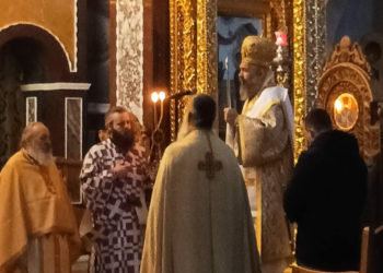 Σύμφωνα με ανακοίνωση της Μητρόπολης, πριν το πέρας της Θείας Λειτουργίας ο Σεβασμιώτατος τέλεσε Ιερό Μνημόσυνο υπέρ μακαρίας μνήμης και αιωνίου αναπαύσεως του Ευσταθίου Λαλαφράγου, συζύγου της δωρήτριας του Ιερού Ναού κ. Περσεφόνης Λαλαφράγκου, του αειμνήστου υιού τους Ευτυχίου καθώς και των συγγενών αυτών.