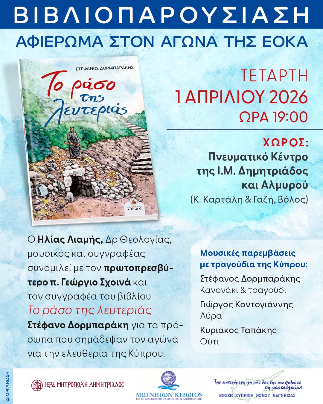 Στο πλαίσιο της εκδήλωσης, ο Ηλίας Λιαμής, Δρ Θεολογίας, μουσικός και συγγραφέας, θα συζητήσει με τον Πρωτοπρεσβύτερο π. Γεώργιο Σχοινά και τον Στέφανο Δορμπαράκη, εκπαιδευτικό, μουσικό και συγγραφέα του βιβλίου «Το ράσο της λευτεριάς».
