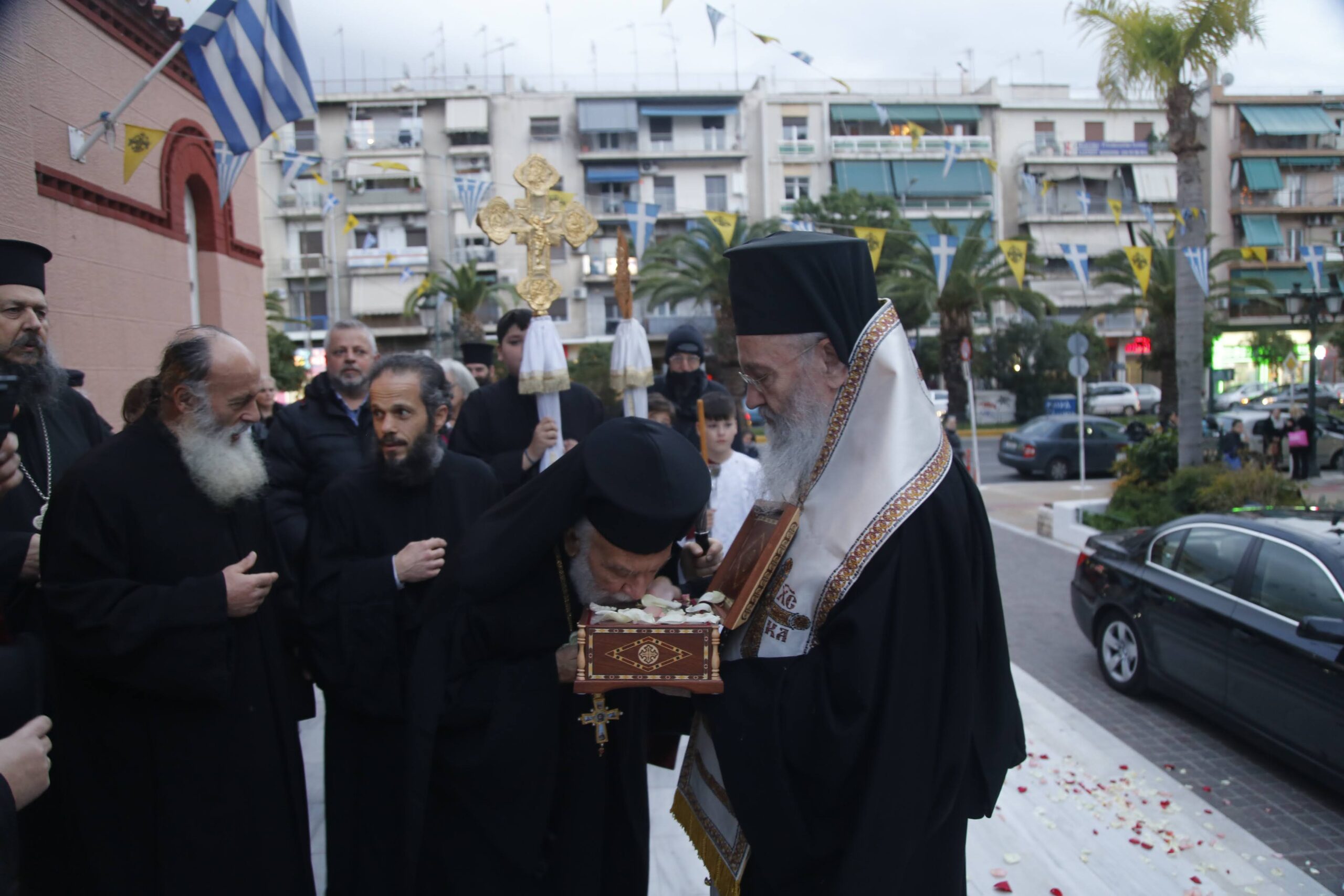 Το απόγευμα του Σαββάτου, 10 Ιανουαρίου, έγινε επίσημη υποδοχή του λειψάνου στο προαύλιο του Ιερού Ναού με την συνοδεία της Φιλαρμονικής του Δήμου και την παρουσία των τοπικών αρχών. Στο κήρυγμά του ο Μητροπολίτης αρχικά ευχαρίστησε του Ιερείς του Ιερού Ναού Αγίων Πάντων Καλλιθέας για την πρόταση, ιδιαιτέρως δε τον Μακαριώτατο Αρχιεπίσκοπο Αθηνών και Πάσης Ελλάδος κ. Ιερώνυμο για την έγκριση να τεθούν σε προσκύνηση τα λείψανα του εν αγίοις Πατρός ημών Καλλινίκου, Επισκόπου Εδέσσης. Έπειτα αναφέρθηκε σε δύο σημεία, πρώτον ότι αγιοκατάταξη σημαίνει ένταξη κάποιου στο Αγιολόγιο της Εκκλησίας. Δεύτερον, ανέφερε τα ορθόδοξα κριτήρια της αγιότητας, ότι ένας άγιος αναγνωρίζεται από την συνείδηση του ορθόδοξου λαού που έχει την διάκριση να ξεχωρίση τον άγιο από τον καλό χριστιανό, τον άγιο από τον ήρωα.