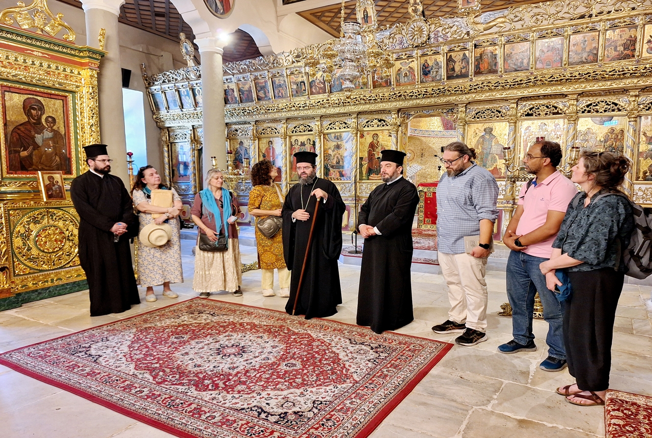 Τους ξενάγησε στους χώρους του Ιερού Ναού και τους μίλησε για την ιστορία του και για την αποπεράτωση των εργασιών ανακαινίσεως και συντηρήσεως αυτού.