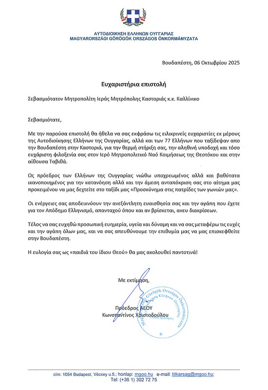 Παρατίθεται η ευχαριστήρια επιστολή του προέδρου, κ. Κωνσταντίνου Χριστοδούλου, προς τον Μητροπολίτη Καστορίας:
