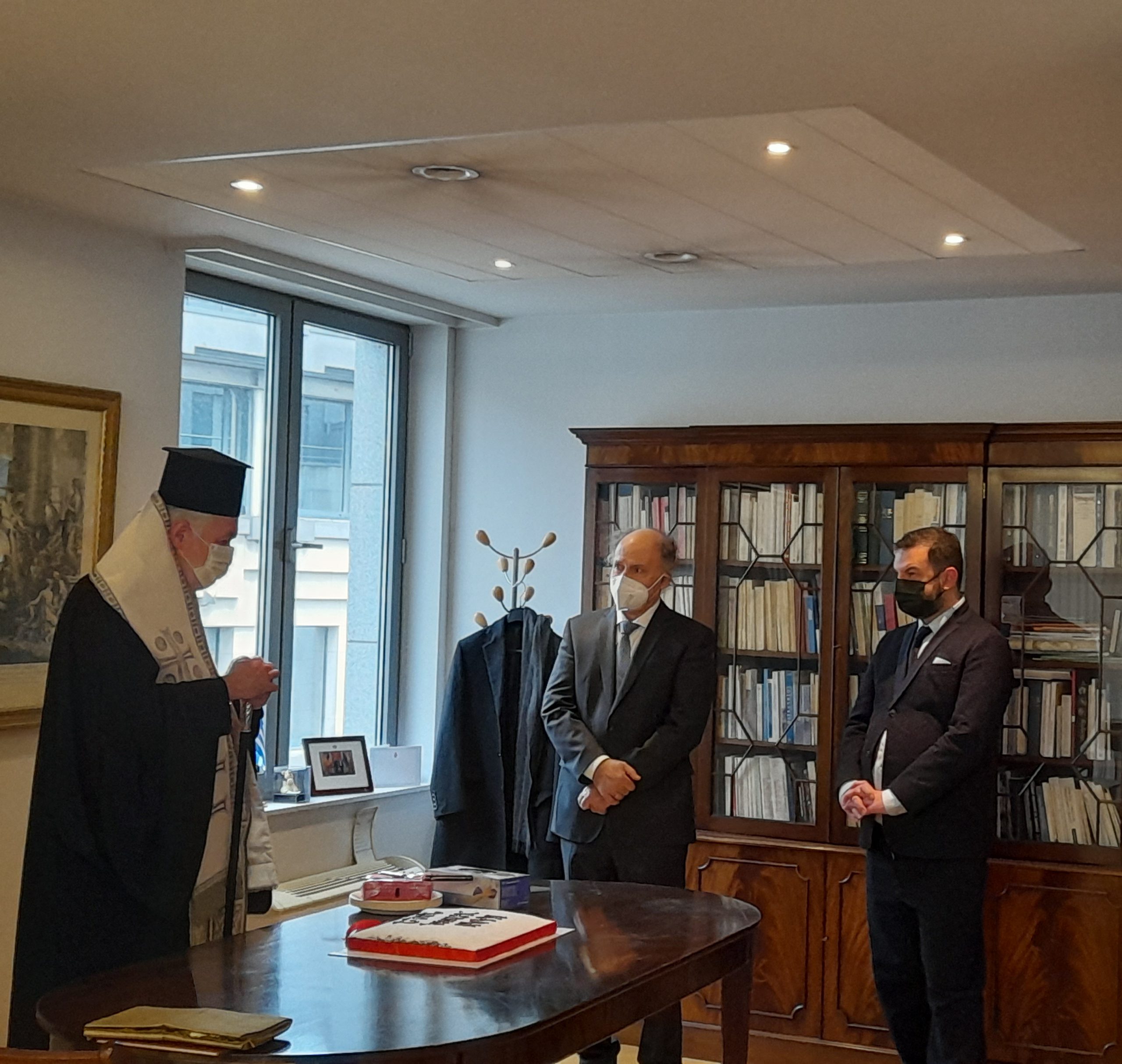Ι.Μ. ΒΕΛΓΙΟΥ: Την Βασιλόπιτα της Ελληνικής Πρεσβείας Βρυξελλών ευλόγησε ο Σεβασμιώτατος Μητροπολίτης Βελγίου και Έξαρχος Κάτω Χωρών και Λουξεμβούργου κ. Αθηναγόρας, το μεσημέρι της 3ης Φεβρουαρίου 2022, κατόπιν προσκλήσεως του Έλληνα Πρέσβεως κ. Διονυσίου Καλαμβρέζου και με την παρουσία του Α΄ Συμβούλου και Διευθυντού του Προξενικού Γραφείου Βρυξελλών κ. Βασιλείου Ζαρμπάλη και των λοιπών συμβούλων και εργαζομένων της Πρεσβείας.
