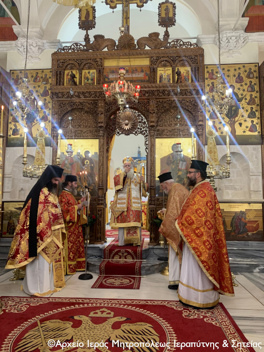 όπου φέτος οι καμπάνες σήμαναν στις 6:00 π.μ. για την Ακολουθία του Όρθρου. Ο Σεβ. Μητροπολίτης Ιεραπύτνης και Σητείας κ. Κύριλλος χοροστάτησε στην ακολουθία του Όρθρου και στη συνέχεια τέλεσε την πανηγυρική Θεία Λειτουργία στον Ιερό Μητροπολιτικό Ναό Αγίου Γεωργίου Ιεράπετρας.