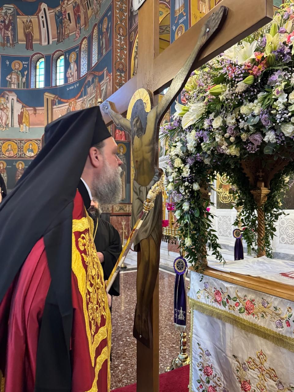 Στο τέλος της Ιεράς Ακολουθίας, ο Σεβασμιώτατος εναπέθεσε το Δεσποτικό Σώμα του Κυρίου στον στολισμένο Επιτάφιο, ραίνοντας το ιερό κουβούκλιο του Επιταφίου, ενώ ο βυζαντινός χορός των ψαλτών απέδωσε μυσταγωγικά το «Σε τον αναβαλλόμενον το φώς ώσπερ ιμάτιον…».