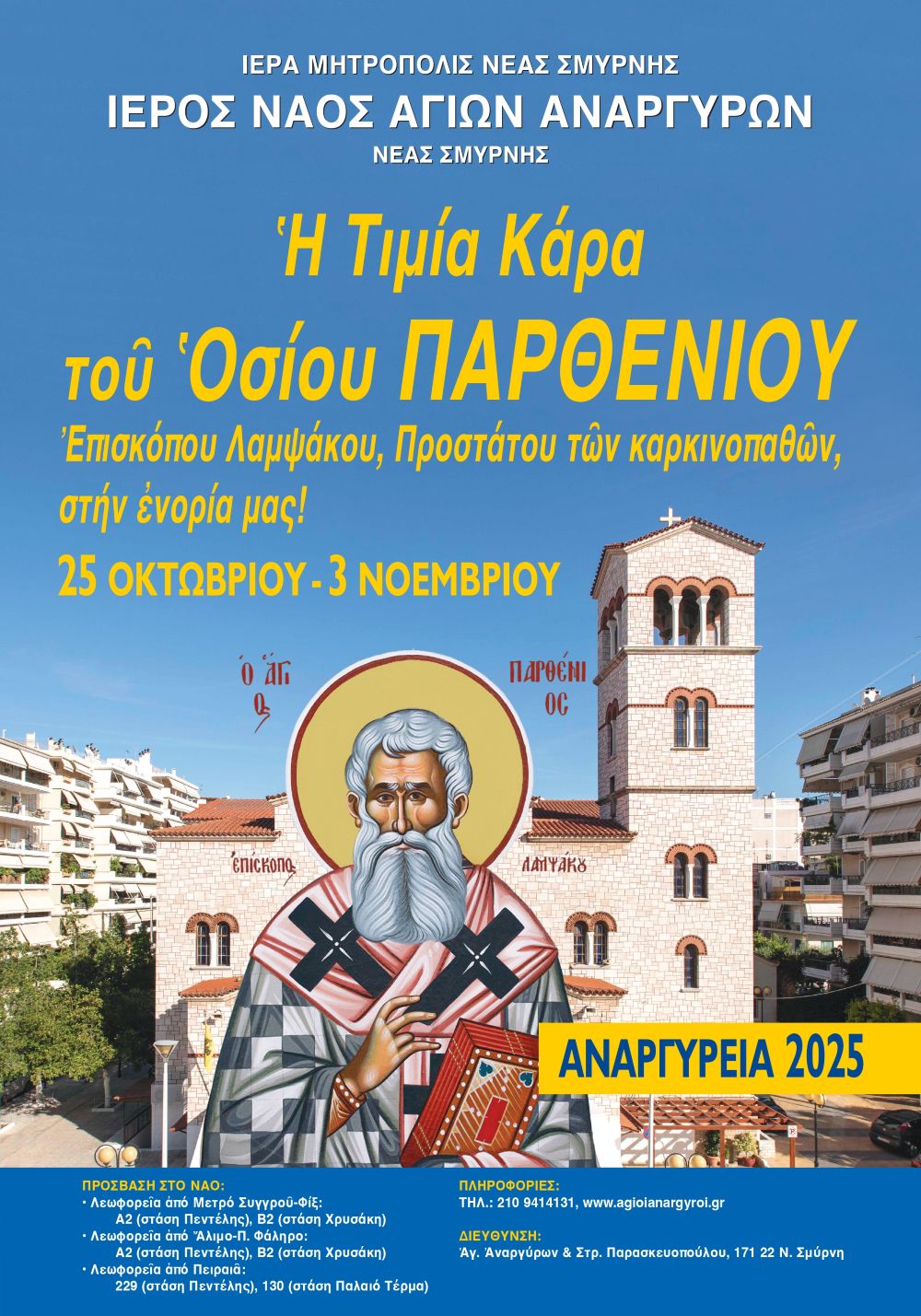 Οι εορταστικές εκδηλώσεις, που φέρουν το όνομα «ΑΝΑΡΓΥΡΕΙΑ 2025», θα ξεκινήσουν το Σάββατο 25η Οκτωβρίου το απόγευμα στις 6.00 με την υποδοχή, στα προπύλαια του Ιερού Ναού, της Τιμίας Κάρας του Οσίου Παρθενίου επισκόπου Λαμψάκου, προστάτου των καρκινοπαθών, από την Ιερά Μονή Κοιμήσεως Θεοτόκου Μακρυμάλλης. Της υποδοχής θα προεξάρχει ο Μητροπολίτης Νέας Σμύρνης κ. Συμεών. Τα «ΑΝΑΡΓΥΡΕΙΑ 2025» θα ολοκληρωθούν τη Δευτέρα 3η Νοεμβρίου το πρωί με την τέλεση της Θείας Λειτουργίας και την αναχώρηση της Τιμίας Κάρας.