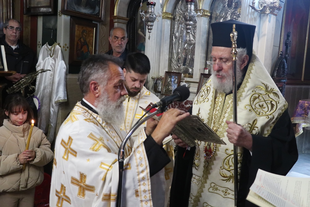 μετά των Εφημερίων του Ναού, Πρωτοπρεσβυτέρων Κωνσταντίνου και Νικολάου Χαρούλη στην οποία συμμετείχαν η Βουλευτής Κυκλάδων κα Αικατ. Μονογυιού, ο Δήμαρχος Σύρου- Ερμούπολης κ. Αλέξ. Αθανασίου, ὁ Αντιδήμαρχος Καθημερινότητας κ. Ιω. Μαραγκός, ο Εισαγγελέας Εφετών Αιγαίου, Εθνοφύλακες και πολλοί πιστοί, μεταξύ των οποίων και μικρά παιδιά, προς τους οποίους ομίλησε περί του ιερού Ευχελαίου και διένειμε στα παιδιά πασχαλινές λαμπάδες.