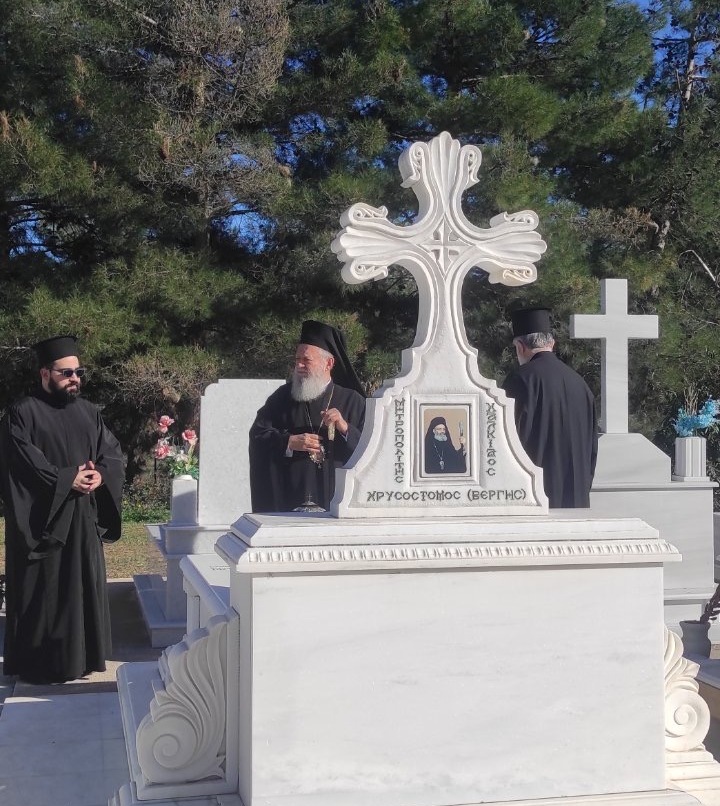 Μετά την απόλυση και τη διανομή του αντιδώρου, ο Σεβασμιώτατος κ. Χρυσόστομος, συνοδευόμενος από τον Πρωτοσύγκελλό του π. Νικόδημο και τον Διάκονό του π. Σταύρο, μετέβη στο νέο κοιμητήριο Χαλκίδος, όπου τέλεσε τρισάγιο υπέρ αναπαύσεως του μακαριστού προκατόχου του Μητροπολίτου Χαλκίδος Χρυσοστόμου Α΄ (Βέργη) και της ευεργέτιδος της Ιεράς Μητροπόλεως Ελένης Πνευματικού-Μπακαρόζου.