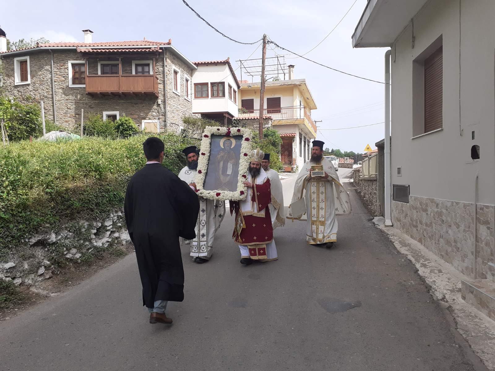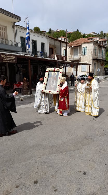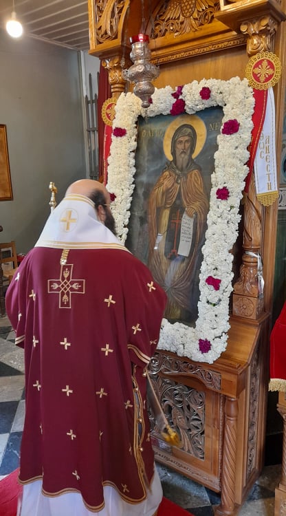 Κλήρος καί Λαός μέ τά απαραίτητα μέτρα κατά τής πανδημίας, συμμετείχε στή Θεία Λειτουργία καί, μετά τό πέρας αυτής, στήν ιερά Λιτάνευση τής θαυματουργού Εικόνος καί τού αγίου Λειψάνου τού Οσίου πατρός Νείλου τού Μυροβλύτου, εντός τού χωριού, ακριβώς στά βήματα πού περπάτησε ταπεινά τά πρώτα του χρόνια ο Άγιος στόν τόπο πού γεννήθηκε.