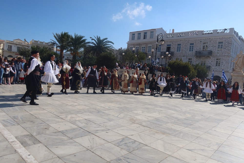 και την του Επισκόπου των ΡΚαθολικών Σύρου κ. Πέτρου Στεφάνου και των Εκπροσώπων των Πολιτικών, Αυτοδιοικητικών, Στρατιωτικών, Δικαστικών, Εκπαιδευτικών Αρχών και των Σωμάτων Ασφαλείας, αντιπροσωπειών μαθητών των Εκπαιδευτικών Ιδρυμάτων της νήσου με τις σημαίες τους, Προσκόπων, Πατριωτικών Συλλόγων, Φορέων και Οργανώσεων.