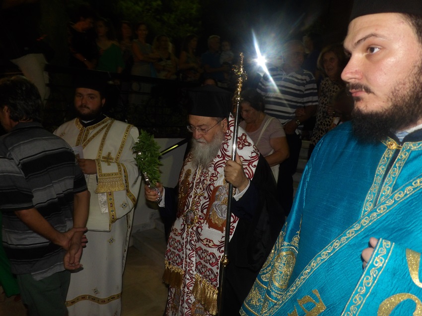 Στον Πανηγυρίζοντα Ι. Ναό Κοιμήσεως της Θεοτόκου Αρχαίας Κορίνθου της Θ. Λειτουργίας προέστη ο Σεβ. Μητροπολίτης Πτολεμαΐδος κ. Εμμανουήλ, ο οποίος ομίλησε επίκαιρα  προς τους πιστούς, που από νωρίς είχαν κατακλύσει τον Ι. Ναό, συγχαίροντάς τους ταυτόχρονα για την πίστη και την αγάπη τους προς την Παναγία Μητέρα του Κυρίου μας. Ολοκλήρωσε τον λόγο του ευχαριστώντας για μια ακόμα φορά τον Σεπτό Ποιμενάρχη μας ο οποίος με πολλή αγάπη του παρεχώρησε Ι. Θυσιαστήριο για να τελέσει την Θ. Λειτουργία, αυτή την τόσο σημαντική ημέρα για την Εκκλησία μας”.