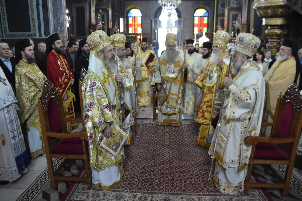 Ακολούθως τελέσθηκε πολυαρχιερατική Θεία Λειτουργία, προεξάρχοντος του Μητροπολίτου Φιλιππουπόλεως κ. Νικολάου και συλλειτουργούντων των Μητροπολιτών Καρπενησίου κ. Γεωργίου, Λήμνου και Αγίου Ευστρατίου κ. Ιεροθέου, του Επισκόπου Λευκουπόλεως κ. Πολυκάρπου, καθώς και του Μητροπολίτου κ. Τιμοθέου, πλαισιωμένων από ιερείς και διακόνους.