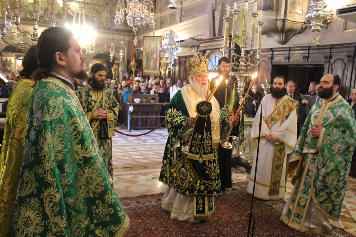Της λιτάνευσης του Ιερού Σκηνώματος προηγήθηκε η τέλεση Αρχιερατικής Θείας Λειτουργίας στο Ιερό Προσκύνημα, ιερουργούντος του Σεβασμιωτάτου, ο οποίος στο κήρυγμά του ανέφερε ότι τον Κύριό μας, προϋπάντησαν ως Θεό στην αγία πόλη Ιερουσαλήμ, τα στόματα των νηπίων, και όλων εκείνων που είχαν άδολη και καθαρή καρδιά, Αυτοί είναι οι λίθοι που αναφέρει η ευαγγελική περικοπή, που κράζουν.