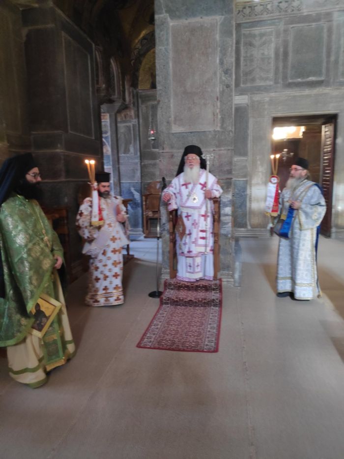 Ο τεράστιος Ναός γεμάτος από βυζαντινές μελωδίες, αλλά άδειος από ανθρώπινες παρουσίες. Στο Ιερό ο Επίσκοπος με τους ιερομονάχους της Μονής, στο αναλόγιο ο ψάλτης, κι ο κυρίως Ναός τόσο άδειος αλλά τόσο γεμάτος όσο ποτέ άλλοτε από τους απόντες παρόντες πιστούς, που με την σκέψη και προσευχή τους κατέκλυσαν το Καθολικό.