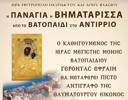 Την Τετάρτη 31 Αυγούστου ο Καθηγούμενος της Ιεράς Μεγίστης Μονής Βατοπαιδίου Αρχιμ. Εφραίμ θα μεταφέρει στο Ναό του Αγίου Νικολάου στο Αντίρριο εν αντγράφω την Εικόνα της Παναγίας της Βηματάρισσας.