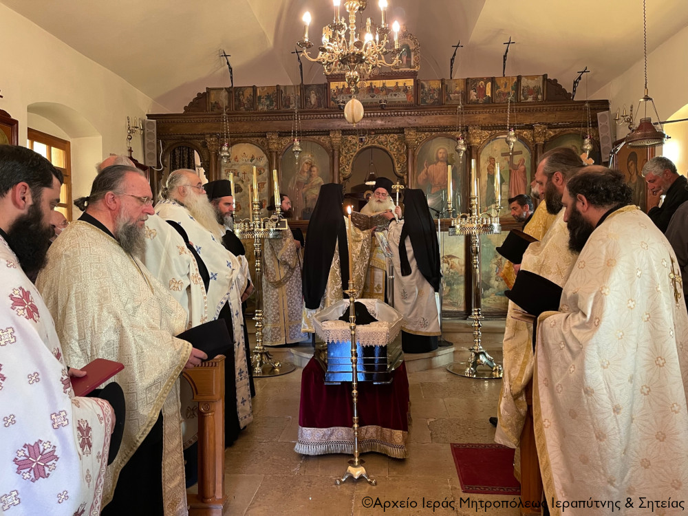 Ι.Μ. ΙΕΡΑΠΥΤΝΗΣ & ΣΗΤΕΙΑΣ: Σε κλίμα έκδηλης συγκίνησης και κατάνυξης τελέστηκε το μεσημέρι της Τετάρτης 15 Μαρτίου 2023 η Εξόδιος Ακολουθία της μακαριστής Μελετίας Μοναχής, κατά κόσμον Αρετής Μπλαζάκη, στο κατάμεστο από πιστούς Καθολικό της Ιεράς Μονής Αγίων Πάντων Αγιασμένου Ιεράπετρας, προεξάρχοντος του Σεβ. Μητροπολίτου Ιεραπύτνης και Σητείας κ. Κυρίλλου, ο οποίος και εκφώνησε τον επικήδειο λόγο.