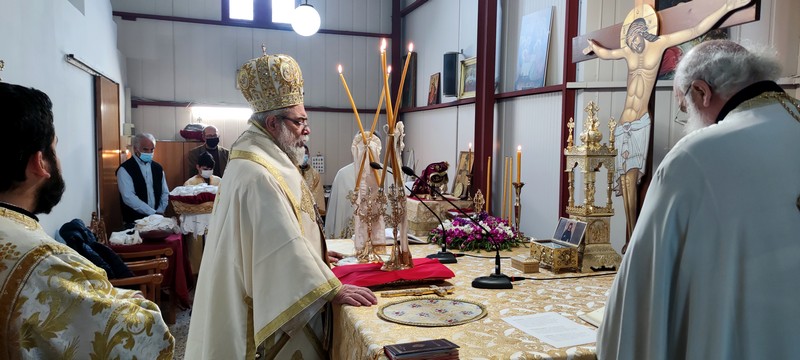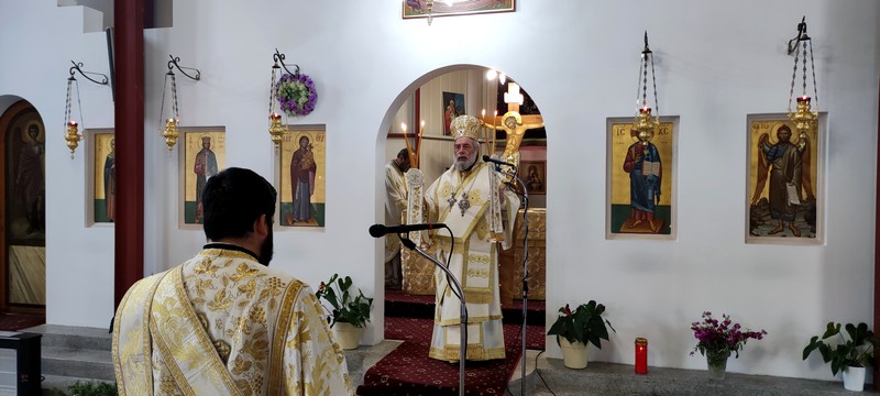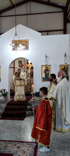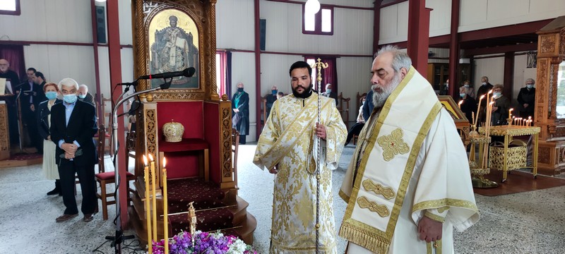 Την πανηγυρική Θεία Λειτουργία τέλεσε ο Σεβ. Μητροπολίτης Γέρων Λεοντοπόλεως κ. Γαβριήλ, του Παλαιφάτου Πατριαρχείου Αλεξανδρείας, πλαισιούμενος από τους Εφημέριους του Ναού, Αρχιμανδρίτη Ευθύμιο Θεοδωρόπουλο, Πρωτοπρεσβύτερο Παναγιώτη Χριστόπουλο, καθώς και τον Ιεροδιάκονο Αναστάσιο Μαντζαφλάρη.