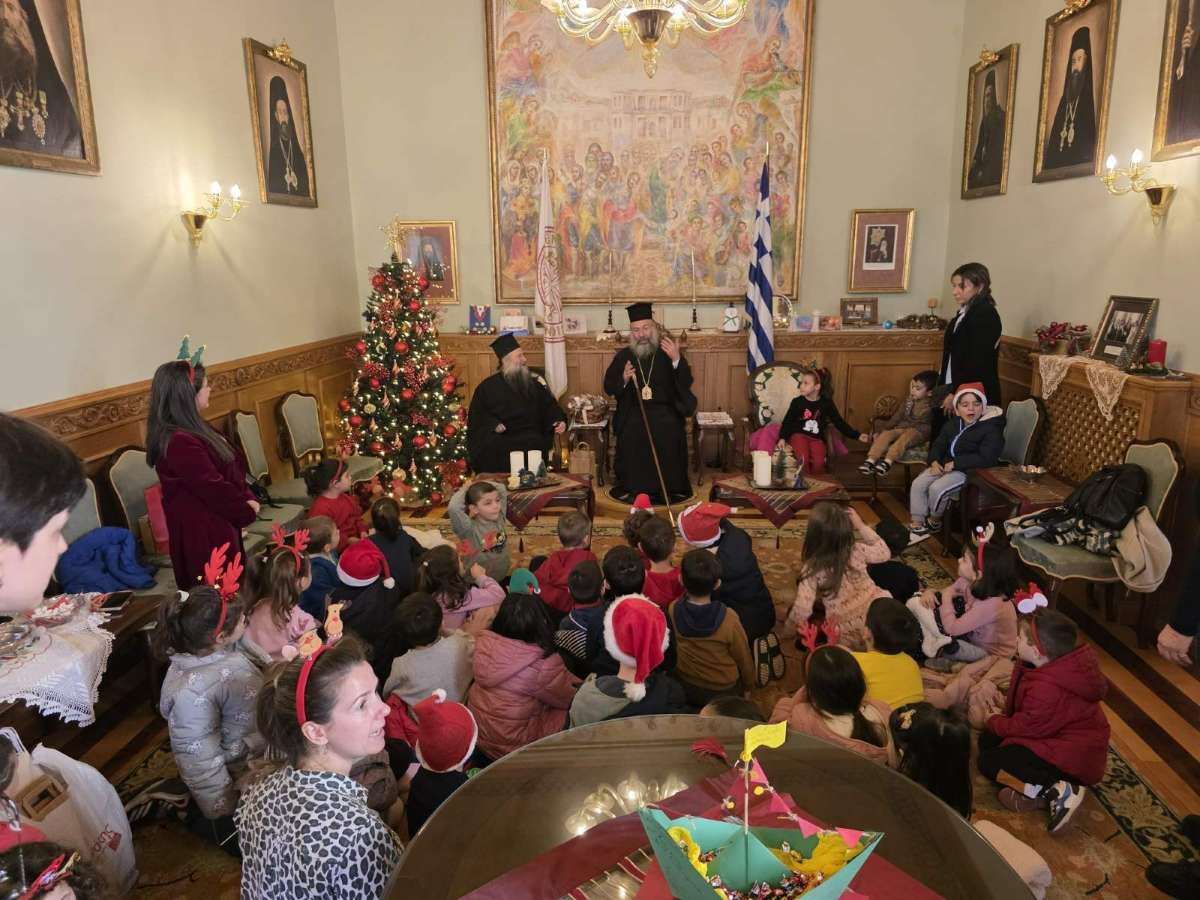 τους «συμμαθητές» του, μαθητές και μαθήτριες του 4ου Νηπιαγωγείου Ρεθύμνου, με τη συνοδεία των εκπαιδευτικών τους, οι οποίοι ήλθαν και έψαλαν στον Μητροπολίτη τα πρώτα χριστουγεννιάτικα κάλαντα για αυτή τη χρονιά.
