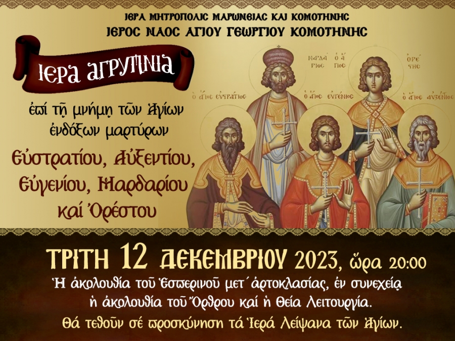 Ι.Μ. ΜΑΡΩΝΕΙΑΣ – Ανακοινώνεται, ότι την Τρίτη, 12 Δεκεμβρίου 2023, το απόγευμα και ώρα 20:00 θα τελεσθεί Ιερά Αγρυπνία στον Ιερό Ενοριακό Ναό Αγίου Γεωργίου Κομοτηνής, επί τη μνήμη των Αγίων πέντε Μαρτύρων Ευστρατίου, Ευγενίου, Αυξεντίου, Μαρδαρίου και Ορέστου.