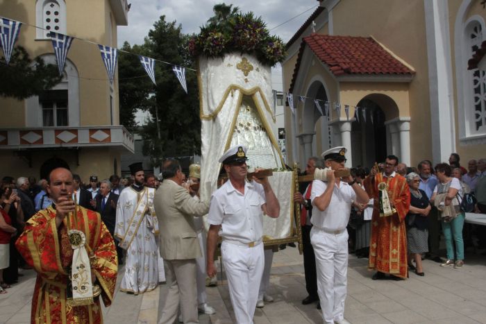 Με το πέρας της Θείας Λειτουργίας, πραγματοποιήθηκε πάνδημη λιτάνευση της Ιεράς Εικόνος της Αναλήψεως, καθώς και Τμήματος Τιμίου Ξύλου, το οποίο βρίσκεται φιλοξενούμενο στο Ναό για προσκύνημα εκ της Ιεράς Μονής Βουλκάνου. Την Ιερά Εικόνα έφεραν επ’ ώμοις άνδρες του Λιμενικού Σώματος.