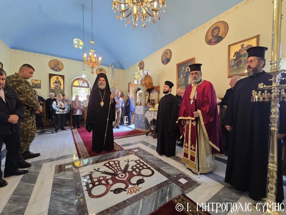 Ο Μητροπολίτης Σύμης κ. Χρυσόστομος αφίχθη στον πανηγυρίζοντα Ι. Ναό, κομίζοντας χαριτόβρυτο τεμάχιο Ιερού Λειψάνου του Αγίου Νεκταρίου, τοποθετημένο σε περίτεχνη θήκη, προκειμένου οι πιστοί να προσκυνήσουν και να λάβουν την ευλογία της Χάρης Του. Εν συνεχεία χοροστάτησε στον Όρθρο, ευλόγησε τους προσφερομένους Άρτους και τέλεσε την Θεία Λειτουργία, ως και την Διακονία του θείου λόγου, με συλλειτουργούς του τον π. Στέφανο Μακρή Γεν. Αρχιερατικό Επίτροπο, τον π. Αντώνιο Μανιά και τον Ιεροδιάκονο π. Παύλο Τερεζάκη. Το ι. αναλόγιο διακόνησαν οι Ιεροψάλτες, πατήρ και υιός, κ. Δημοσθένης και Μερκούριος Γιανναράς, ενώ μεταξύ άλλων εκκλησιάστηκαν ο Δήμαρχος Σύμης κ. Ελευθέριος Παπακαλοδούκας και ο Δκτης ΔΑΝ Σύμης Συνταγματάρχης κ. Χαράλαμπος Κατηφόρης.