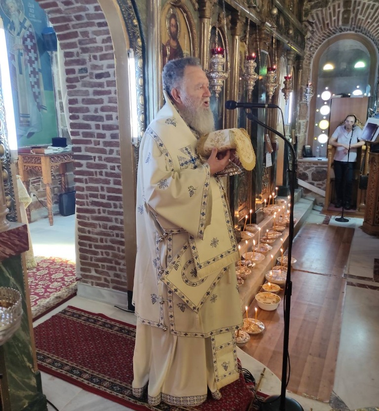 Εκεί, προσέφερε τη Θεία Λειτουργία, συλλειτουργούντος, εκτός των συνοδών του, και του Εφημερίου της Ενορίας, Πρωτοπρεσβ. Σταματίου Μπασδέκη, κήρυξε τον θείο λόγο προς το εκκλησίασμα ερμηνεύοντας τον ψαλμικό στίχο του Κοινωνικού «Μακάριοι ους εξελέξω και προσέλαβου Κύριε», ενώ τέλεσε και τα μνημόσυνα των απ’ αιώνος κεκοιμημένων αδελφών μας.