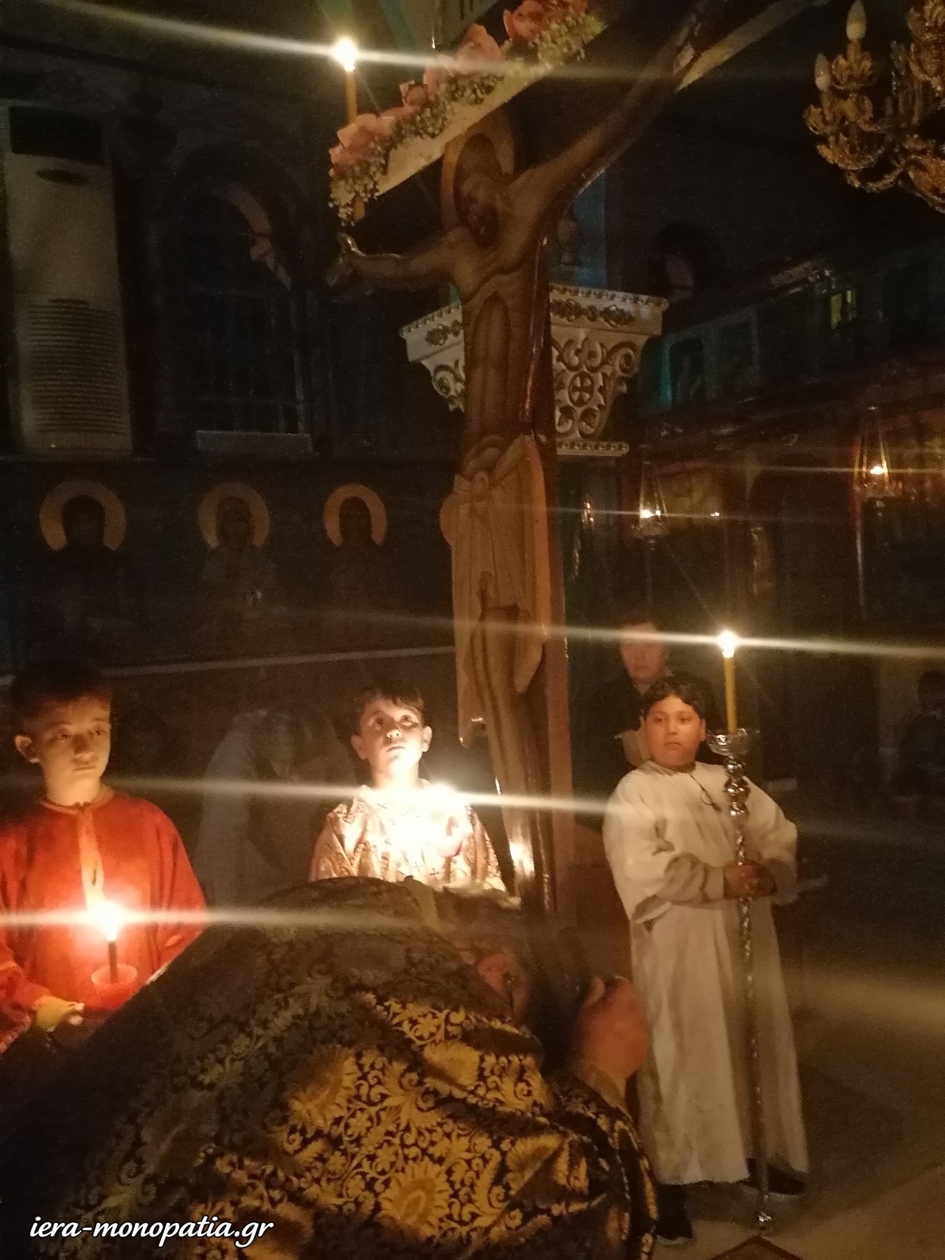 Μέσα σε ατμόσφαιρα ιερής σιγής και δέους, οι πιστοί γονάτισαν μπροστά στον Εσταυρωμένο, αφήνοντας την ψυχή τους να ποτίσει από το άγιο δάκρυ της μετανοίας και της ευγνωμοσύνης. Το «Σήμερον κρεμάται επί ξύλου» συνόδευε την πορεία του Θεανθρώπου προς τον Γολγοθά, ενώ τα πρόσωπα όλων ήταν στραμμένα προς τον Σταυρό, σαν να προσπαθούσαν να Του ψιθυρίσουν ένα σιωπηλό «ευχαριστώ».