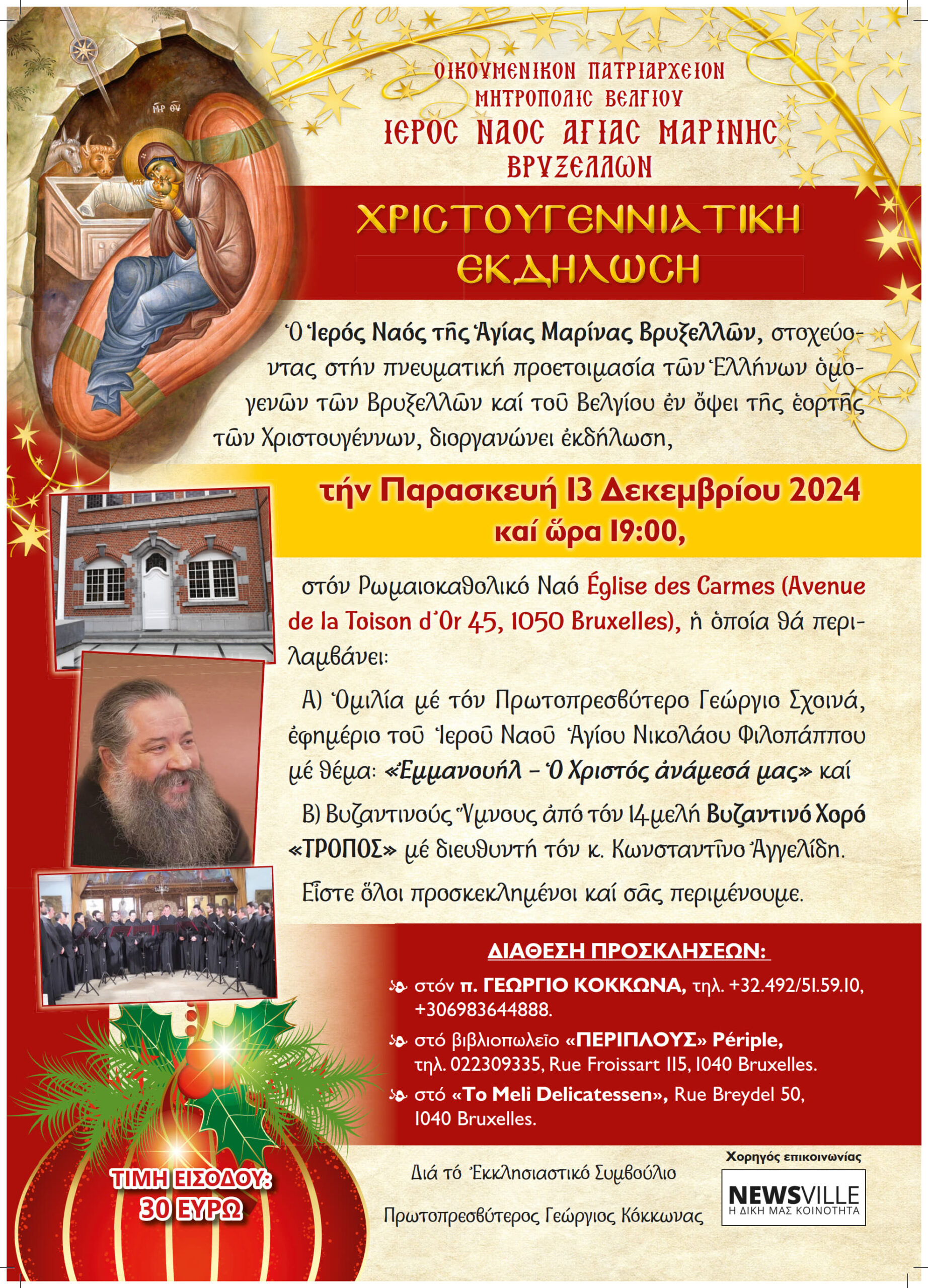 ΒΡΥΞΕΛΛΕΣ-Ο Ιερός Ναός της Αγίας Βαρβάρας Βρυξελών, στοχεύοντας στην πνευματική προετοιμασία των Ελλήνων Ομογενών της περιοχής ενόψει της εορτής των Χριστουγέννων, διοργανώνει εκδήλωση την Παρασκευή 13 Δεκεμβρίου 2024, στις 7 το απόγευμα, στον Ρωμαιοκαθολικό Ναό.