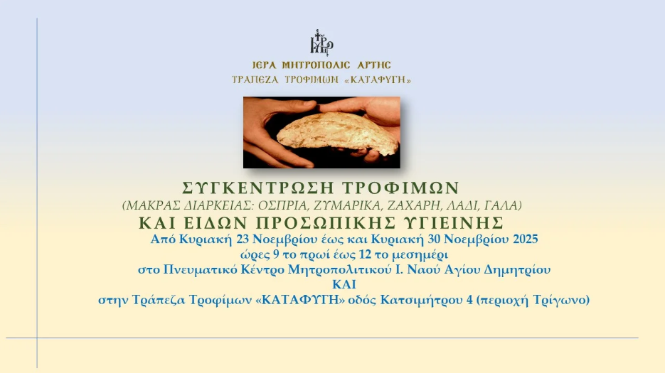 Καθώς πλησιάζουν τα Χριστούγεννα, απαιτείται πιο εντατική και συντονισμένη προσπάθεια, για να βοηθηθούν περισσότεροι συνάνθρωποί μας. Από το κάλεσμα αυτό της Μητρόπολης Άρτης δεν πρέπει να απουσιάσει κανείς. Όλοι μπορούν να συμβάλουν στη συγκέντρωση τροφίμων μακράς διαρκείας (όσπρια, ζυμαρικά, ζάχαρη, λάδι, γάλα) και ειδών καθαριότητας, που θα γίνει από την Κυριακή 23 Νοεμβρίου 2025 έως και την Κυριακή 30 Νοεμβρίου 2025, στο Πνευματικό Κέντρο της Ενορίας Αγίου Δημητρίου Άρτης, επί της οδού Σκουφά 91-93 (ώρες 9:00 π.μ. έως 12:00 το μεσημέρι) και στην Τράπεζα Τροφίμων «ΚΑΤΑΦΥΓΗ», επί της οδού Στρατηγού Κατσιμήτρου 4, στην περιοχή Τρίγωνο (ώρες 9:00 έως 12:00 το μεσημέρι). Επίσης, όποιος διευκολύνεται μπορεί να παραδώσει την προσφορά του στον Εφημέριο της Ενορίας του, ο οποίος θα την παραδώσει στην «ΚΑΤΑΦΥΓΗ».