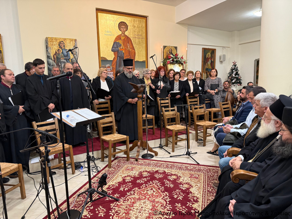 Η Χορωδία της Σχολής Βυζαντινής Μουσικής της Ιεράς Μητροπόλεως «Άγιος Ανδρέας ο Κρήτης», υπό τη διεύθυνση του Διευθυντή της Σχολής και Πρωτοψάλτου του Ι. Μ. Ναού Αγίου Γεωργίου Ιεράπετρας κ. Ιωάννη Αρώνη απέδωσε άρτια και με εξαιρετική μελωδικότητα και ενάργεια ύμνους και παραδοσιακά κάλαντα του αγίου Δωδεκαημέρου. Εψάλησαν το Απολυτίκιο της εορτής των Χριστουγέννων “Η Γέννησις σου Χριστέ ο Θεός ημών…” (ήχος δ΄), τα τροπάρια των Προφητειών του Εσπερινού της ίδιας εορτής “Λαθὼν ετέχθης…” και “Ανέτειλας Χριστέ…” (ήχος πλ. β΄), οι ειρμοί της α΄, γ΄ και θ΄ ωδής των Καταβασιών του Όρθρου της εορτής των Χριστουγέννων (ήχος α΄), το κάθισμα “Δεύτε ίδωμεν πιστοί” (ήχος δ΄), το “Και νυν…” των Αίνων της εορτής των Χριστουγέννων “Σήμερον ο Χριστός εν Βηθλεὲμ γεννάται εκ Παρθένου” και στίχοι από τη Δοξολογία του Σαρανταεκκλησιώτου (ήχος β’), ο ύμνος της εορτής της Περιτομής του Κυρίου “Συγκαταβαίνων ο Σωτήρ…” (ήχος πλ. δ΄), το δοξαστικό των Αίνων της εορτής του Μεγάλου Βασιλείου “Εξεχύθη η χάρις…” (πλ. β΄), το δοξαστικό της Θ΄ Ώρας της εορτής των Θεοφανείων “Την χείρα σου την αψαμένην την ακήρατον κορυφήν του Δεσπότου” (ήχος πλ. α΄) και τα στιχηρά των Αίνων της εορτής των Θεοφανείων “Φώς εκ φωτός…”, “Πως σε Χριστέ…” και «Το αληθινόν φως επεφάνη…».