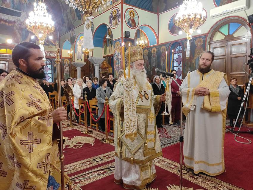 Τον Μητροπολίτη πλαισίωσαν ο Σταυροφόρος – Οικονόμος π. Νικόλαος Βαρδουνιώτης, Εφημέριος του Ι. Ναού και οι Διάκονοι π. Χρήστος Χίλιας, π. Σωτήριος Κουτσούρης και π. Άγγελος Σαλάτας.