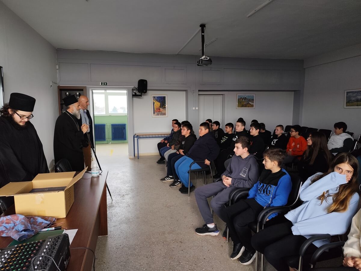 Ο Μητροπολίτης, συνομιλώντας με τους μαθητές, τους εξήγησε πως ήρθε για να τους δει και να τους προσφέρει την Καινή Διαθήκη για το μάθημα των Θρησκευτικών. Τους προέτρεψε, όταν βρίσκουν λίγο χρόνο, να την διαβάζουν στη νεοελληνική μετάφραση. Τους συμβούλεψε να μην παίζουν μόνο με το κινητό, αλλά με μέτρο, και να διαβάζουν και άλλα βιβλία.