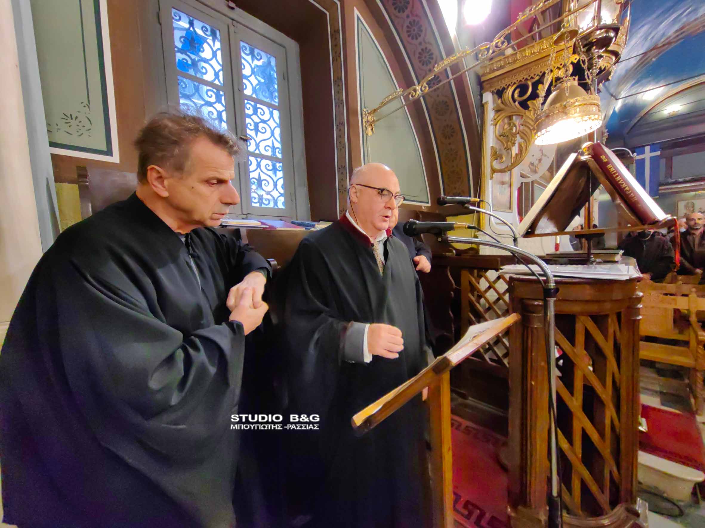 Κατά τις Ιερές ακολουθίες έψαλλε ο πρωτοψάλτης του μητροπολιτικού Ιερού ναού Αγίου Γεωργίου Δημήτριος Καρκαλάτος .
