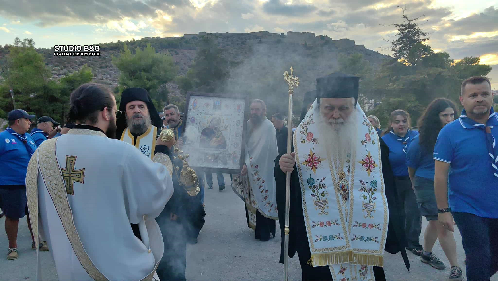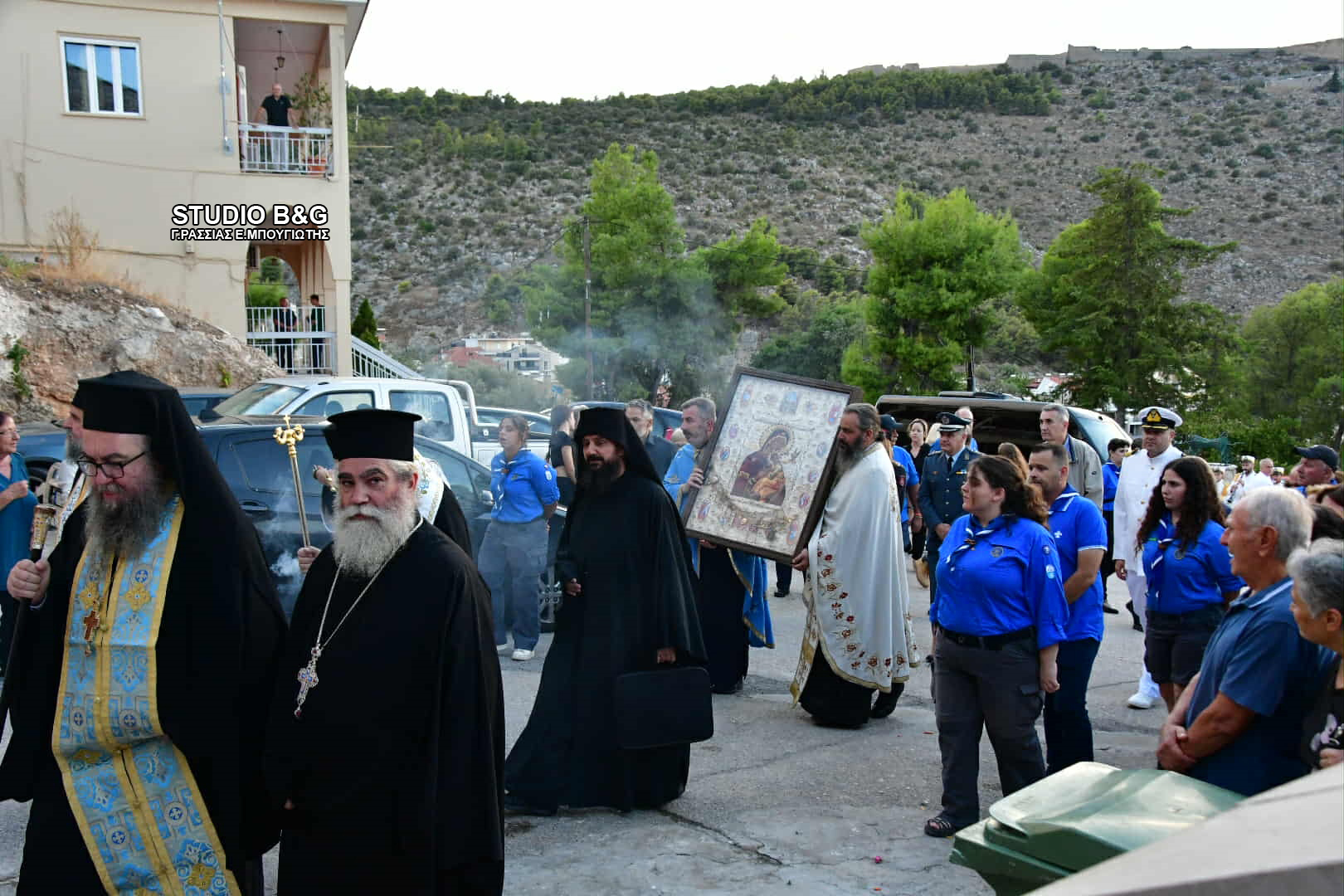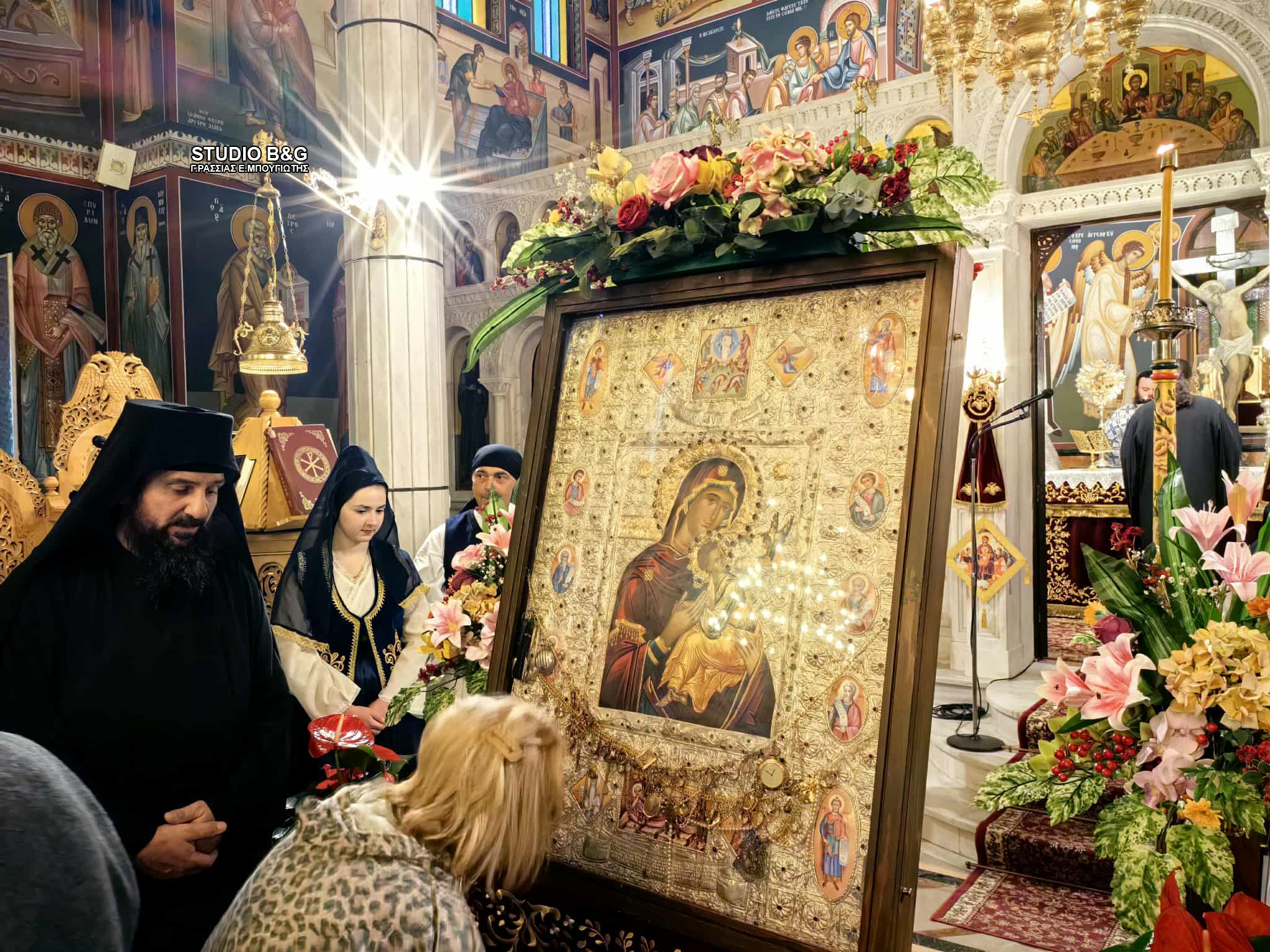 Μετά την υποδοχή της εικόνας ακολούθησε αρχιερατικός εσπερινός από τον Μητροπολίτη Αργολίδος κ. Νεκτάριο. Κατά τις Ιερές ακολουθίες έψαλε η χορωδία της Σχολής Βυζαντινής Μουσικής της Ιεράς Μητροπόλεως Αργολίδος, υπό την διεύθυνση του πρωτοψάλτου Δημητρίου Καρκαλάτου και προέδρου του συνδέσμου Ιεροψαλτών Αργολίδας.
