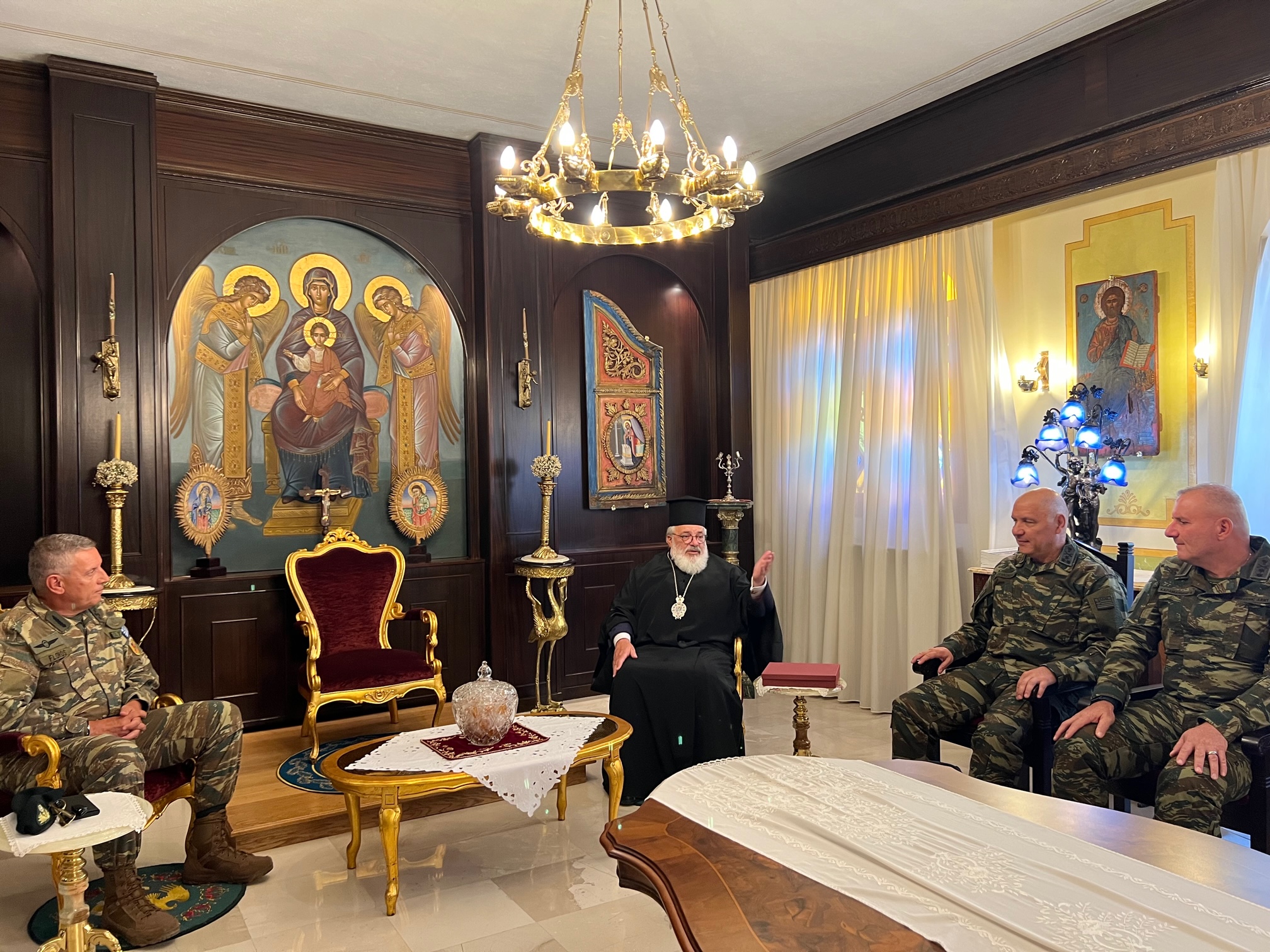 Τον Στρατηγό συνόδευαν ο Διοικητής του Δ΄ Σώματος Στρατού Αντιστράτηγος Δημόκριτος Κωνσταντάκος, ο Διοικητής της XVI Μεραρχίας Υποστράτηγος Κωνσταντίνος Καραμανίδης και επιτελικά στελέχη του ΓΕΕΘΑ. Μετά από μία γόνιμη συζήτηση για θέματα συνεργασίας των Ενόπλων Δυνάμεων και Εκκλησίας ο Σεβασμιώτατος προσέφερε εικόνα της Θεοτόκου με την ευχή η Υπέρμαχος Στρατηγός να προστατεύει και να καθοδηγεί τις Ένοπλες Δυνάμεις της Πατρίδας μας.