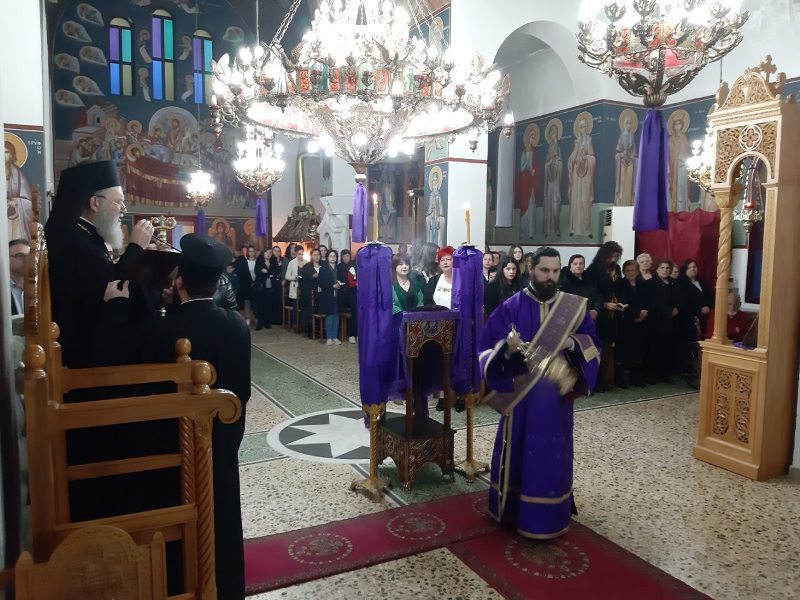 Το απόγευμα της Μεγάλης Δευτέρας 23 Απριλίου 2019, ο Σεβασμιώτατος, συνοδευόμενος από τον Αρχιμ. Μεθόδιο Φουντούλη-Εφημέριο του Ι. Προσκυνήματος Παναγίας Φανερωμένης Ν. Αρτάκης και τους Διακ. Νικόλαο Πριμηκύριο και Ευγένιο Τσάλλα, χοροστάτησε κατά την Ακολουθία του Νυμφίου (Όρθρος Μ. Τρίτης) στον Ιερό Ναό Αγίας Παρασκευής Μακρυκάπας Μεσσαπίων, παρόντος και του Δημάρχου Διρφύων – Μεσσαπίων κ. Γεωργίου Ψαθά.